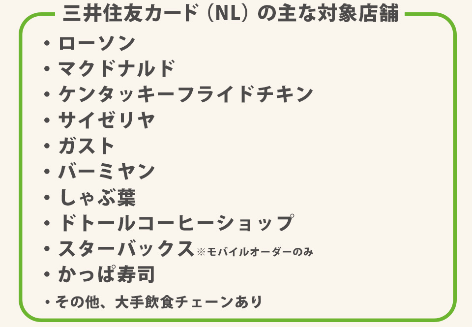 普段使っているお店に下記の店舗が多いなら、三井住友カード(NL)も対象店舗で最大20%ポイント還元となる。