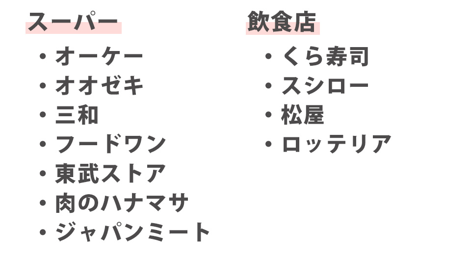 セブン‐イレブン、東急ストアの他、下記のスーパーや飲食店なども最大20%ポイント還元の対象になった。