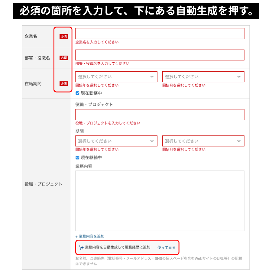 年収や学歴などの基本項目に答えるだけで、約5〜10分で完了。在籍企業での業務内容なども、必要最低限の情報を入力すればAIが自動生成してくれます。