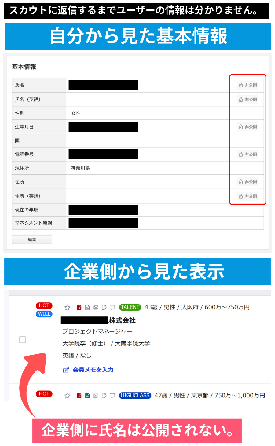 2.氏名などの個人情報はスカウトに返信しない限り非公開