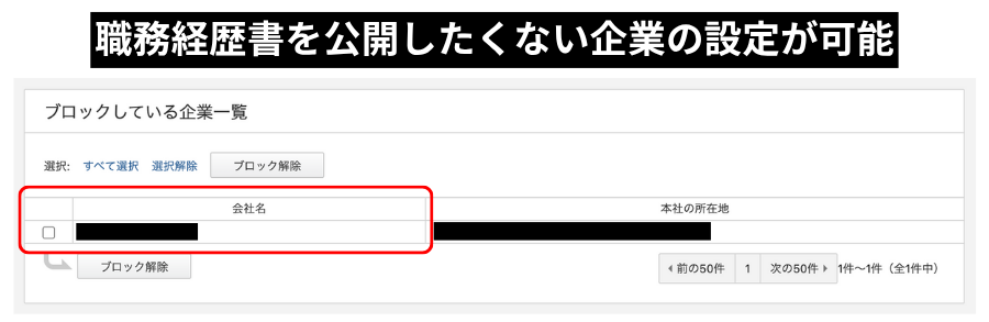 レジュメの登録時点で現職の企業は「ブロック」設定になっています。ブロック対象の企業は追加も可能で、前職の企業などにも自身のレジュメを閲覧されないようにすることができます。