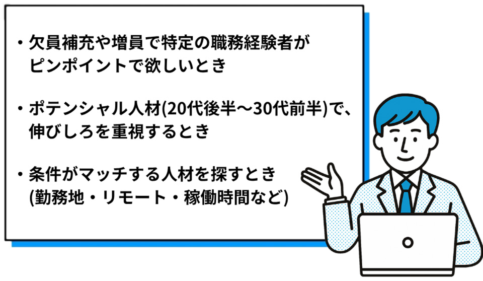 採用側は「欠員の即戦力」「ピンポイントで業務経験のある人材」「今後の成長が期待できる若手」など、さまざまな目的で幅広い職種・年代にスカウトを送っています。